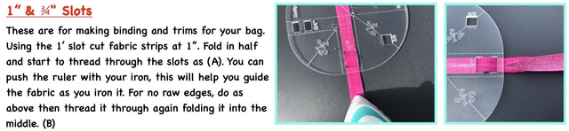 Also has slots that help you make small binding for the edges or piping. Has a handy ¼" and ⅜" hols to check your seams. Inside the back is one Bobby template this is to store you thread on wile you are not using it.